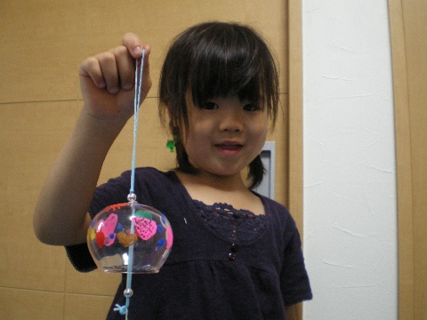 ステンドグラス風に仕上げたKちゃん(5年生)。外側から黒で縁取りを描いて、中側から着色しました。きれいな蝶々が出来ました。 ヨットや魚、すいかなどをたくさんつり下げたK君(1年生)。夏らしい涼しげな作品が出来ました。 スイカやドーナツ、ハートなど大好きな形を器用にハサミで切ったRちゃん(年中)。「パパへのプレゼント!」です。 おねえちゃんを待っている間におえかきしていたS君(年少)。「はいポーズ!」 風にあたるとキラキラの色の変化が楽しみなHちゃん(1年生)の力作。早く飾り付けたいね。 ずーっと笑いながら楽しそうに作っていたRちゃん(1年生)。作品も楽しさでいっぱいです。 モノクロのしぶい作品を作ったしゅんたくん。イタリアのデザイナーズ風鈴のようです。 大好きな恐竜シリーズ。S君(年長)はハサミ使いもすごく上手で器用に形を切り抜きました。 風に吹かれると魚が追いかけっこするように工夫したSちゃん(3年生)。アイデアがいっぱいつまった風鈴です。 イチゴのかき氷やお花など涼しげなアイテムをたくさんぶら下げたTちゃん(5年生)。すっきりときれいに出来ました。 ガラスを埋め尽くすように水玉をたくさん描いたMちゃん(年中)。Mちゃんらしいかわいい作品になりました。 にこにこ顔をぶら下げたKちゃん(年中)。風鈴にもたくさん顔を描きました。かわいくできて大満足。 大好きな果物などをたくさん描いたUちゃん(1年生)。下には大きな花もぶら下げました。 Sちゃん(年中)はハートや雪だるまをぐるっと描きました。 「はやく飾りたい!」 得意のドラゴン線画シリーズ!?M君(2年生)のこだわりが随所に見られる風鈴です。線画が涼しげです。 大好きな女の子やハートをたくさん作ったMちゃん(1年生)。「Mってうまくなったわぁ」と本人も大満足の出来上がりです。 圭司君(年中)は。水玉をたくさん描いて、下にはいろいろな形をすごくたくさん貼り付けました。ハサミもずいぶん上手になりました。 Hちゃん(年中)の「仲良し家族シリーズ」。大好きなパパとママを描いたよ。ながーい紙も頑張って作れたね。