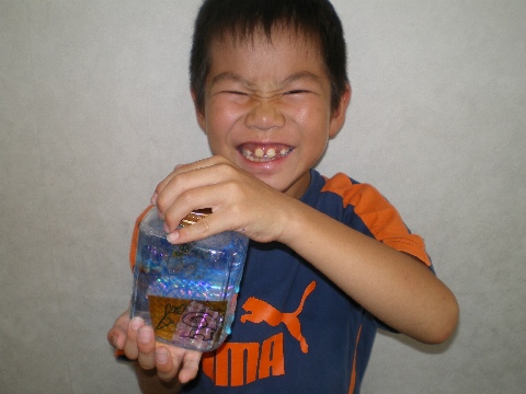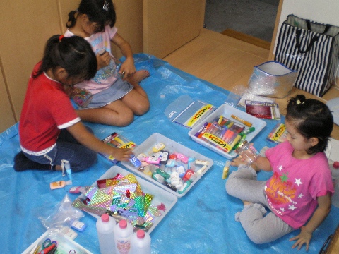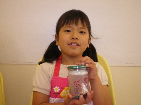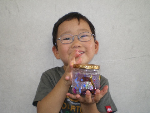かわいいたこや魚を一生懸命つくったKちゃん。仕上がりの丁寧さ、かわいさに拍手! Rちゃんはおねえちゃんと水玉や星などとてもたくさんの模様を描いて楽しそうでした。 Sちゃん(年長)びんのなかにたくさんのスパンコールを入れて。「きれい〜!」。 Sちゃん(3年生)は大好きなよつばを中にいれたり、かわいいいちごの絵を丁寧にびんに描きました。きれいな仕上がりに大満足。 Aちゃん(年長)。「中にもいれるん?」とかわいいたこちゃんを泳がせて。楽しそうな水族館ができました。 Rちゃん(年中)は大好きなハートや水玉を。キラキラ大好きなRちゃんはとても楽しそうに制作していました。 R君(1年生)中に入れる魚などをすごく慎重に丁寧に仕上げました。工作大好きだね。 R君(年長)。大きな瓶に模様を一生懸命描きました。中に入れるものも選んでいれました。 おねえちゃんといっしょに参加したCちゃん。キラキラに夢中。 ママと一緒に楽しそうに作っていたHちゃん。ちょっとはずかしそうだったけどキレイなビンができてうれしそうでした。 Hちゃん(1年生)「何いれよっかなぁ」楽しそうにいろいろと想像をめぐらせて。賑やかな水族館ができました。 しゅんた君(2年生)は「深海にする!」と深海らしい植物などものすごく考えて作りました。深海魚の形もかっこいい! Mちゃん(1年生)は女の子や水玉を。「前やったやつよりめっちゃうまいで!」と本人も大満足です。 Mちゃん(年中)はビンの水が動かなくなるぐらいにスパンコールをぎっしり詰め込みました。とても楽しそうでした。 いつもながら丁寧に仕上げるTちゃん(5年生)。瓶の中にはかわいいたこや魚が気持ちよさそうに泳いでいます。 中にスパンコールを入れたり、外にもたくさんはったり。工夫を凝らしてどんどん楽しんでいったUちゃん(1年生)とKちゃん(年中)。 「きれ〜い!」とスパンコールに夢中だったHちゃん(年少)。ハサミをうまく使ってホログラム折り紙もたくさん入れました。 ガラスの瓶に描いたたこがすごくかわいい!裏には魚も泳いでいます。K君(1年生)の力作です。 圭司くん(年少)は瓶にたくさんの水玉を。水を何度も眺めて大喜びでした。 線画がすごく得意なM君(2年生)は、ビニールにいくつものドラゴンを描いて泳がせました。名付けて「ドラゴン博物館!」 すごい集中力で瓶に絵を描いていたA君(1年生)。緊張していたけど出来上がりには大満足です。 K君(1年生)はたくさん泡が口からぶくぶく出ている魚を描きました。涼しそう! 大好きな水色を使って魚を描いたS君(年長)。中のホログラムも重なって涼しげです。