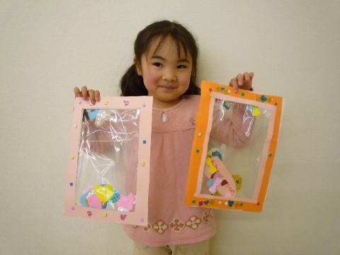 透明フィルムや画用紙を使って万華鏡カードを作りました。 周りは好きなように飾り付け。フィルムの中にもいろんなものをいれて動かしてみました。 かわいい顔のなかに小さなきらきらを入れたSちゃん(4年生)。周りも大好きな黄色でかわいく。 おともだちの誕生日のプレゼントに、と張り切って2枚も作ったRちゃん(年長)。中にはメッセージも。 ブラックに銀色が映えるしゅんたくん(3年生)のカード。中にはたくさんのモザイクチップが。 ハートやリボンなど女の子らしいかわいい素材がたくさん。Rちゃん(2年生)の作品。 圭司くん(年中)は周りも丁寧に金色を貼って仕上げました。中にはセロファンも。 Mちゃん(年長)は大好きなピンクをたくさん使って。大きなリボンも中に入れました。 Tちゃん(6年生)は中にスマイリーなどのキャラクターを。動かす度にいろんな顔が。 すごい集中力で回りにモザイクチップを一生懸命貼っていたYちゃん(年中)。ちょっとおつかれ? 小さいハートをたくさん切り抜いて飾り付け。Mちゃん(1年生)はすごく丁寧に仕上げました。 大きな飾りをたくさん中に入れたおちゃらけ姿のAちゃん(年長)。ゆきだるまちゃんもかわいいね。 母の日のプレゼントにしたやさしいMちゃん(2年生)。ママも喜ぶね。 回りに丁寧にチップを貼って仕上げたHちゃん(年中)。チューリップを貼ったり、中にはセロファンもたくさん入れました。 「あかが好きやねん」と赤をたくさん使って仕上げたAくん(1年生)。キラキラ光ってきれい〜。 枠の部分をドラゴンの口の中に見立てて、中には食べられた人など楽しい工夫がいっぱいのSくん(1年生)の作品。 セロファンで花をたくさん作って中に入れたUちゃん(2年生)。光にすかして眺めていました。 ハートをたくさん切って中にも外にも使ったKちゃん(年長)。とってもかわいくできました。 回りの飾りを一生懸命工夫していたMちゃん(3年生)。女の子らしいかわいらしい飾りができました。 きれいにチップを並べてすごい集中力!Tくん(3年生)は中にたくさんの魚たちを。 「透明だけでやる」と中にカラーセロファンをたくさん入れたHちゃん(2年生)。色の重なりがきれいでした。 回りを一生懸命飾っていたMちゃん(年中)。丁寧にひとつひとつ貼っていく姿がとてもかわいかったです。 Nちゃん(1年生)は中に入れる素材にすごく工夫を凝らして。いちごやフルーツもひとつひとつ丁寧に作りました。 すごく細かい魚たちをたくさん入れていたNくん( 2年生)。ハサミ使いがすごく上手です。 「なにいれよ〜」ととにかくたくさん切ったものを入れ込んだRくん(3年生)。「ごみばこみたいになったわ!」と。 海の中の様子に仕上げたHちゃん(3年生)。潜水艦や海草など工夫がいっぱいで楽しい作品になりました。