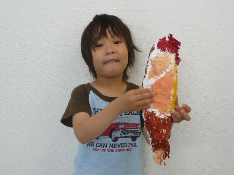 裏も表もていねいに赤を塗って仕上げました。Rちゃん(年長)の金目鯛。なんだかおいしそう! 針がたくさん飛び出したAちゃん(2年生)のハリセンボン。グレーの模様もていねいに仕上げました。 いつもカラフルなNちゃん(1年生)らしいきれいな色づかいの魚。オレンジや赤がとってもきれいです。 一生懸命色塗りもがんばっていたMちゃん(年中)。まっかな金目鯛です。 カラフルな魚が印象的なHちゃん(3年生)の作品。ピンクの尾がかわいい。 背中にとがったひれのあるきれいな魚を作ったRちゃん(2年生)。水玉もようもかわいい魚です。 黄色い水玉もようがとてもかっこいいHくん(1年生)の作品。開いた口もうまく特徴をつかんでいます。 ふっくらとしたかわいいはこふぐを作ったRちゃん(2年生)。丸みのあるフォルムがとてもかわいくできました。 さわやかな青が印象的なYちゃん(年中)の魚。黄色のしっぽもかわいくできました。 大きな目が特徴のMちゃん(1年生)の金目鯛。赤やピンクの塗り分けもとてもうまくできました。 鮮やかな黄緑がとってもきれいなMちゃん(年長)のさかな。黒い目もかわいいです。 とってもていねいに大きなタイを作ったTちゃん(6年生)。鯛焼きやさんの看板にできそう! 大きなサメに挑戦したAちゃん(年長)。色づかいもとってもカラフルでかわいい! 「さかなつりにして!」とポーズも決まったMちゃん(2年生)。大きなタイをつり上げました。