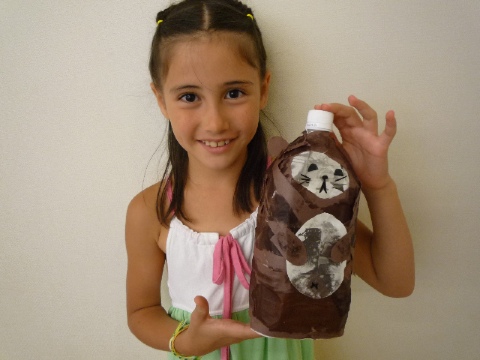 ペットボトルに和紙を貼り付けて貯金箱作りをしました。 何重も色を貼り付けて動物作り。根気のいる作業も真剣です。 リボンをつけてかわいいうさぎちゃんに。Hちゃん(年中)。 お金を入れるところをギザギザにしたりしっぽをつけたり。おおかみを作ったSくん(1年生) 。