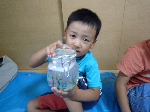 「さかなむずかしい!」といいながらも出来上がった瓶をフリフリ「きれ〜い」。Yちゃん(1年生)。 小さい魚ををたくさんいれてこんなにかわいい水族館。Yちゃん(年中)です。 水の中でゆらゆらした海草をたくさん描いたMちゃん(1年生)。 回りもきれいに飾り付けたMちゃん(3年生)とてもかわいい水族館になりました。