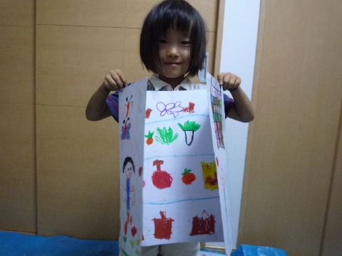画用紙を折り曲げてドアを作りました。外側をドア、中を部屋などそれぞれ工夫しています。 「ドアっていっぱいあるよなぁ、冷蔵庫もトイレも部屋もドアやし〜」との問いにそれぞれが工夫を凝らします。 ドアを開ければ「冷蔵庫」。野菜がたくさんのYちゃんの冷蔵庫です。 ドアを開ければ「洋服屋さん」。かわいい服がたくさん売っているMちゃんのショップです。 ドアを開ければ「おみせやさん」。洋服やお花がたくさんならんだYちゃんのお店です。 ドアを開ければ「冷蔵庫」。野菜や果物がたくさん入ったAちゃんの冷蔵庫。ドアにはカレンダーまで。 ドアを開ければ「ゆうれいの部屋」。外側もとってもこわいTくんのお部屋です。 ドアを開ければ「冷蔵庫」。マヨネーズやソース、果物などとってもリアルなUちゃんの冷蔵庫。 ドアを開ければ「自分の部屋」。寝ているのはKちゃん?。 ドアを開ければ「おうち」。テレビやダイニング。おうちの様子をたくさん描いたMちゃん。 ドアを開ければ「おばけやしき」。最近はやりの妖怪シリーズを描いたTくん。確かにこわそう! ドアを開ければ「怪談レストラン」。化け猫が出迎えてくれます。Aちゃんは鉛筆で丁寧に。 ドアを開ければ「おばけやしき」。Sくんは赤のクレヨンがなくなるほど一生懸命塗りました。 ドアを開ければ「冷蔵庫」。イチゴやサクランボがたくさん。Mちゃんのカラフルな冷蔵庫です。 ドアを開ければ「宇宙が広がって」。星やUFO、画面いっぱいに宇宙を描いたSくん。 ドアを開ければ「なに?」。恐竜や星など好きなもので。Nくんはどこでもドア〜。 ドアを開ければ「わたしの部屋」。かわいいもの大好きのRちゃん。アクセサリーでいっぱい。 ドアを開ければ「マクドナルド」。Aちゃんはハンバーガーを売っている店員さんやお客さんまで。よく観察しているね。