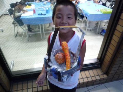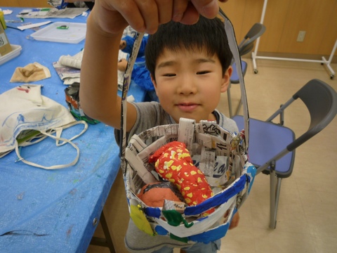 前回製作した野菜を入れるかごを新聞紙で編み上げました。 細く丸めた新聞紙を何本も作って丸く編んでいきます。 どこがどうなっているか段々わからなくなっていくこどもたちです。 女の子たちは丁寧に。細かく編んでいます。 「ぼうし〜!」