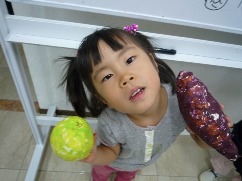 にんじんやかぼちゃなどのお野菜をいろんな方向からデッサンして、紙粘土で制作しました。 いろいろな角度からの観察〜。「むずかしいなぁ」。 なんども色合わせして本物そっくりに仕上げていきます 。 どっちが本物かわからないような野菜たち 。