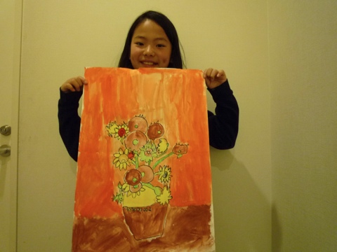 写楽やゴッホ、有名な画家の絵を模写しました。「結構むずかしい〜」 。 風船を使った作業も。みんな夢中です。どんなお面&帽子ができるかな。ユニーク&目立つものを目指します。 細かいところもよく観察している3年生のIくん。 Aくん(3年生)は波しぶきもよく見て描きました。 陰の色も自分で工夫して進めたHちゃん(1年生)。観察力のすごさを感じさせられます。 ゴッホのひまわりも描く人によっていろんな表情がおもしろちゃん(1年生)とNちゃん(3年生)。 背景に虹を描いたり、こどもたちの自由さも面白い模写。Yちゃん(1年生)。絵の具ははじめてのNくん(1年生)。